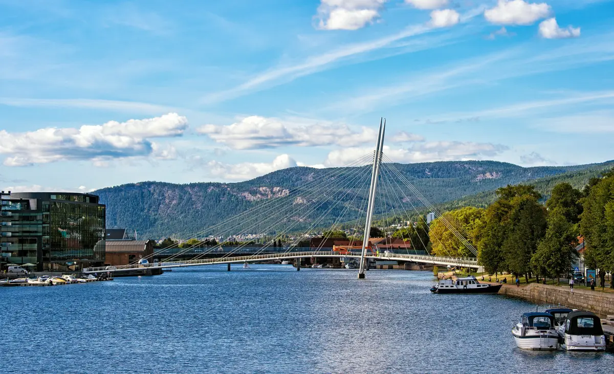 Ypsilon Bridge crossing the river in Drammen, Norway, highlighting modern architecture and scenic waterfront views.
